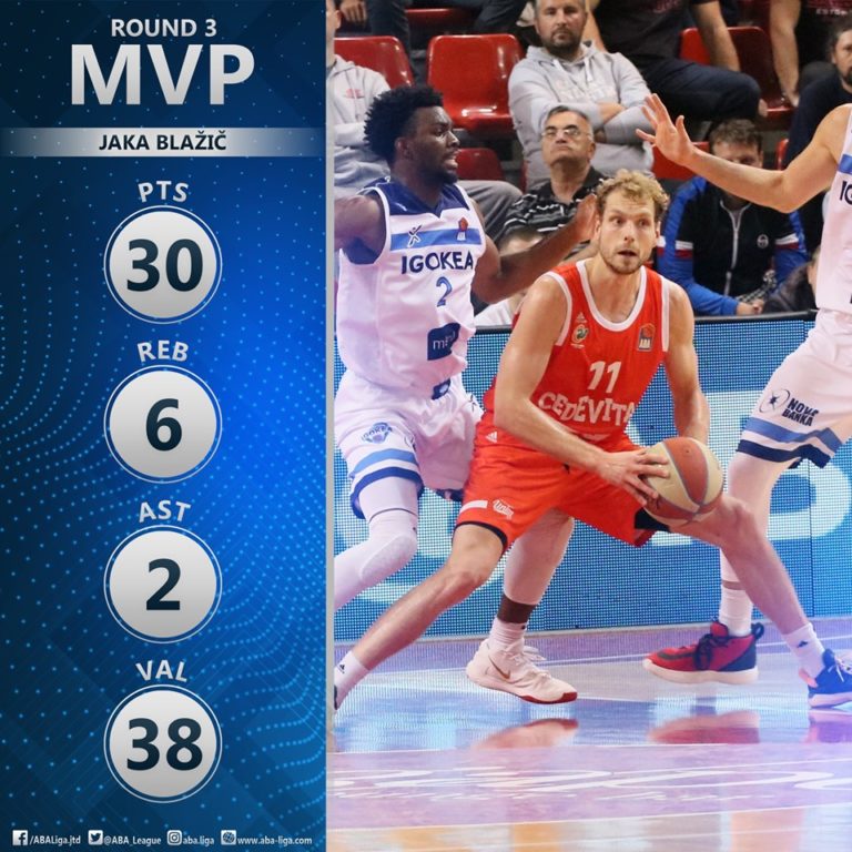 Jaka Blažič je najkorisniji igrač trećeg kola ABA lige. Slovenački košarkaš je Igokei u Laktašima ubacio 30 poena(4/7 za tri)...